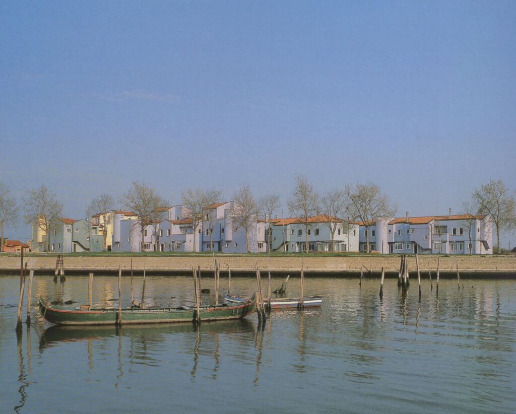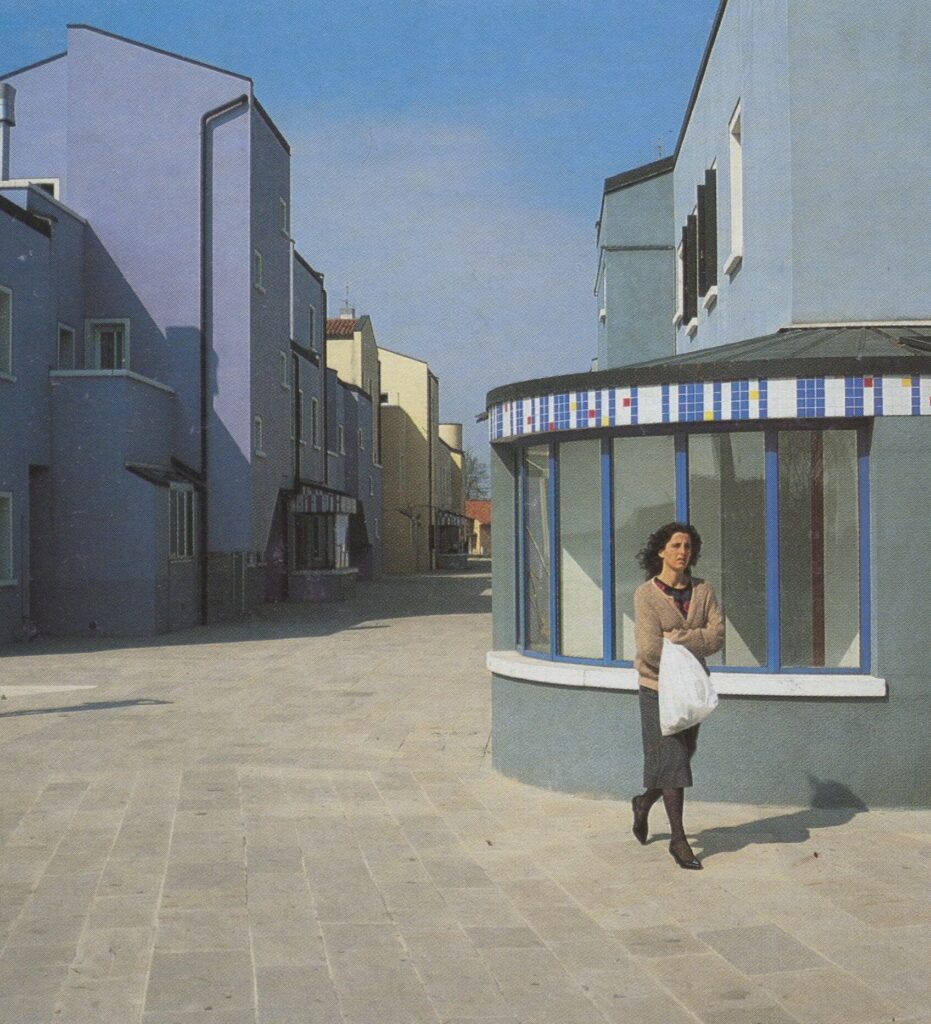 Quando negli anni Ottanta il piano PEEP Burano-Mazzorbo prevede la costruzione di nuove abitazioni per ripopolare l’isola, la questione non è solo quantitativa. Ottanta casette rappresentano un corpo potenzialmente estraneo, una massa che rischia di alterare l’equilibrio fragile tra terra, acqua e cielo. In terraferma sarebbe un semplice edificio, ma qui non può esserlo. In laguna ottanta case devono essere ottanta casette. È in questa tensione tra necessità e misura che si inserisce il progetto di Giancarlo De Carlo, realizzato tra il 1980 e il 1997. Un intervento che, a prima vista, appare come un gesto deciso: un pugno colorato nella tonalità lattiginosa della laguna. Violetto, verde e giallo sono tinte che emergono come segni contemporanei, dichiaratamente moderni. Eppure, attraversando il quartiere, quell’impressione di forza si trasforma in una percezione più sottile: non c’è imposizione, ma costruzione paziente di relazioni.